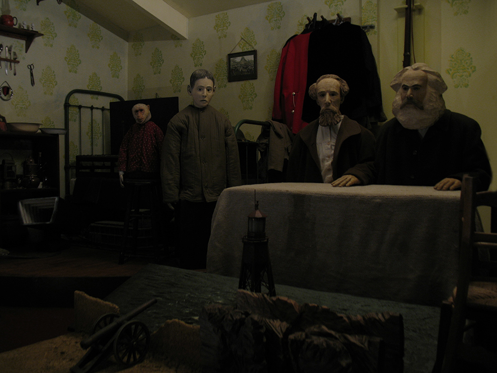 J'ai toujours eu une tendresse particulière pour ces "bricoleurs" qui dans l'espace exigu d'un garage ou d'une petite pièce aménagée s'inventent un univers, entre souvenirs des jeux de l'enfance et le resserrement sur la proximité des choses qui aide à rendre le monde plus supportable. C'est par ce principe que j'ai "bâti" l'ensemble de mon récit, dans une pièce de mon atelier de 6m x 6m qui devait contenir l'ensemble des décors, des maquettes, des objets et des personnages. Chaque chose présente, j'ai pris le temps, comme une connaissance nécessaire, de les fabriquer une à une par la sculpture. Chaque élément est venu progressivement occuper cet espace intérieur à des échelles différentes, une rue et une mansarde à échelle 1 et à l'autre extrémité des montagnes de quelques centimètres. Quand cette pièce au bout du voyage s'est retrouvée remplie, j'ai commencé des prises de vue photographiques répertoriant les possibles que ces décors contenaient. Je me suis placé au sein des situations, jouant des places et des histoires que me proposait chaque accessoire. Toutes ces photographies, rejointes par la suite par quelques dessins, se sont rassemblées en de longues bandes, entre table de montage et récit graphique, devenant chapitre après chapitre un ensemble tissant les situations et leurs résonances historiques.